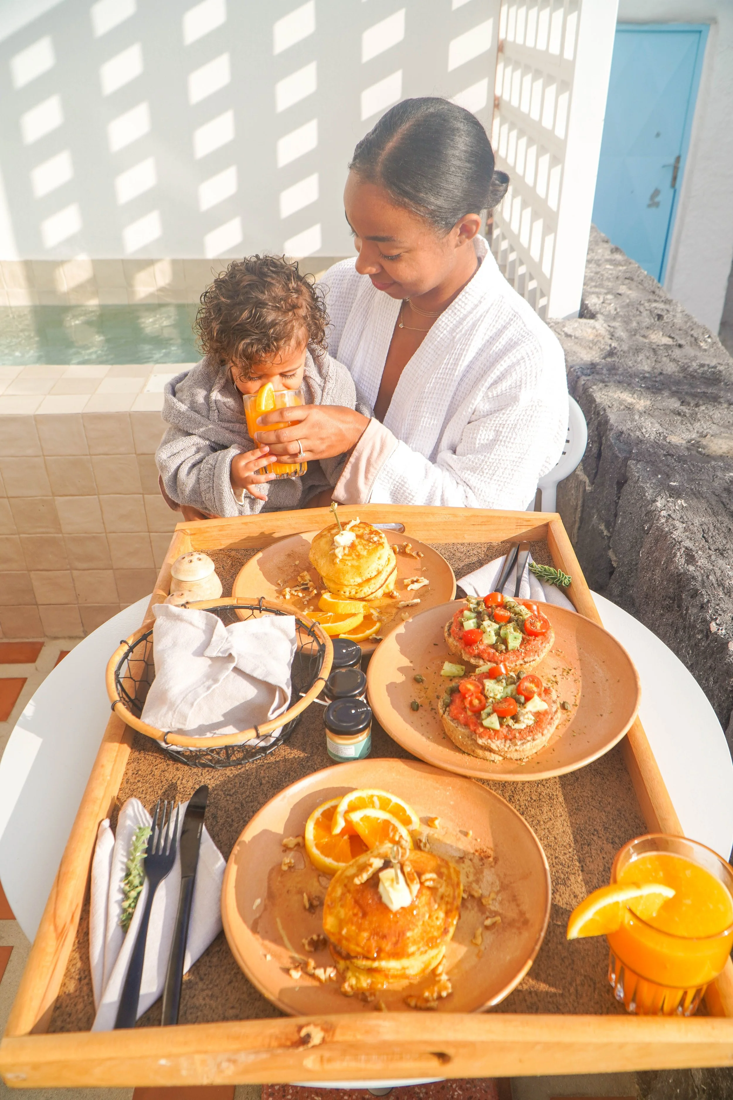 We also stayed at Ethos Vegan Suites which was an excellent stay right in the heart of Fira. While there aren’t any stunning views here like you’ll find at Katikies, the hospitality is absolutely incredible! The hotel is family owned and they will treat you as such when you stay with a homemade breakfast fit for royalty! Everything in the hotel is sustainable and ethically sourced down to your bathroom soap. The owner will also make sure your little one is right at home with a crib, baby friendly amenities, and their own tiny sized room service platter. You will absolutely love your stay here and walk away feeling like you gained new family members as the owners are truly just that kind!